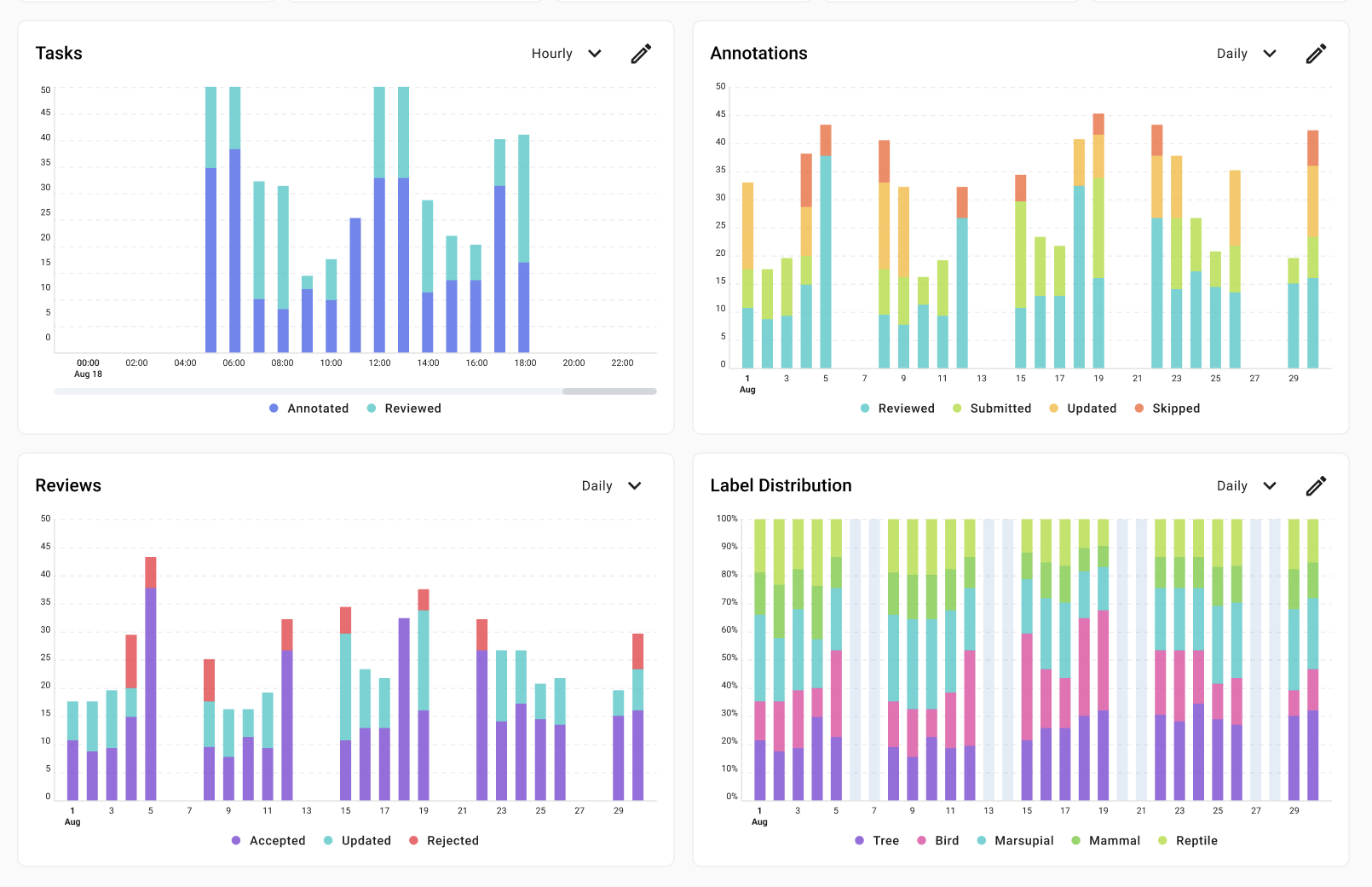 Each time series chart can be viewed as is or can be customized by clicking on the colored circle next to each metric’s name in the chart legend. For instance, click on “Annotated” in Task Chart to view only the reviewed tasks over time. You can also change the chart granularity for each chart using the dropdown menu which provides time range presets that are most appropriate for the time period selected in the date time selector. To reset the charts back to the default view, use the flyout menu next to the date time selector.