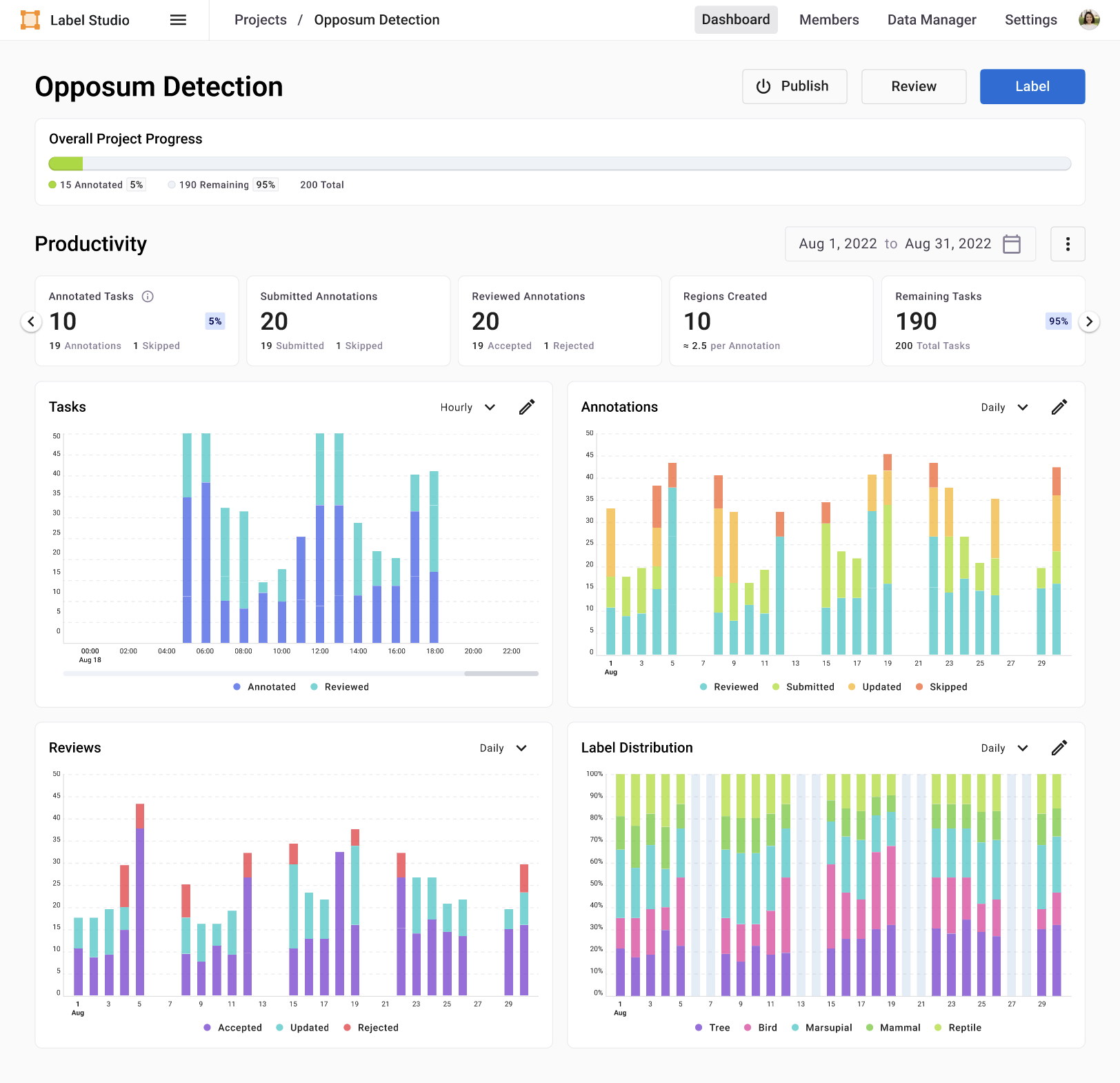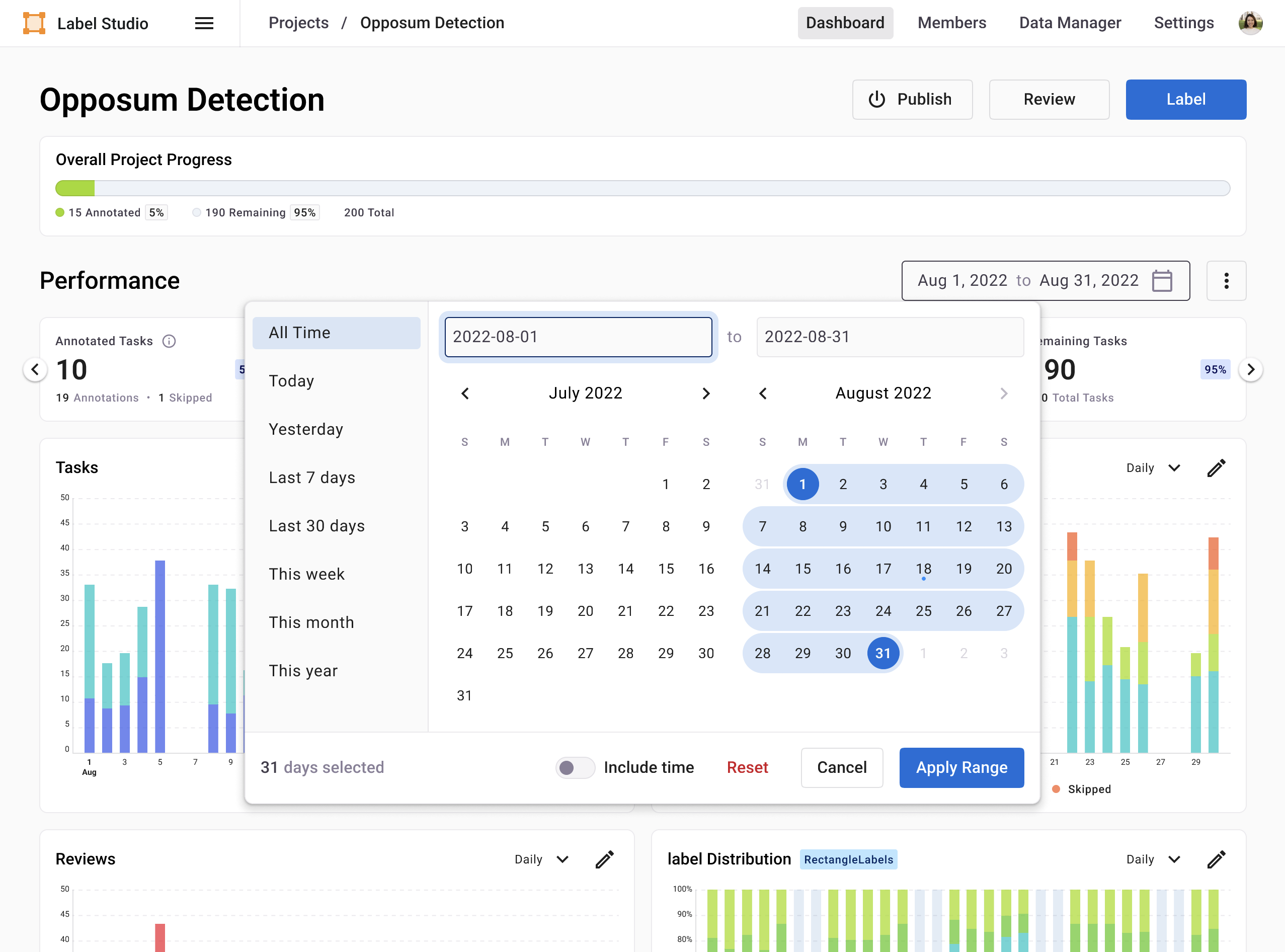 View the status and progress of reviewed and annotated tasks during a specific time range in order to understand if more annotators or reviewers should be assigned to the project.