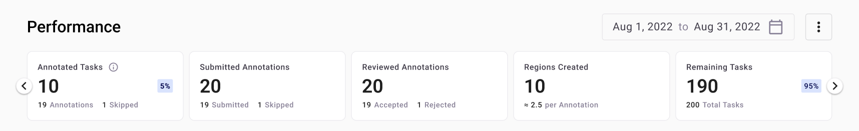 • Tasks Pending Review: Remaining tasks that have not been reviewed for annotations submitted during the time period specified. This card also displays the annotation count for annotations submitted but not yet reviewed.