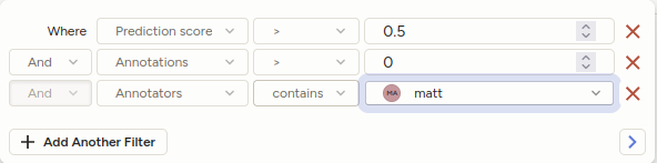 With filters and tabs, you can split data into different sections to be labeled by different annotators, or set up data in a particular order to perform labeling according to prediction score, or another value in your data.