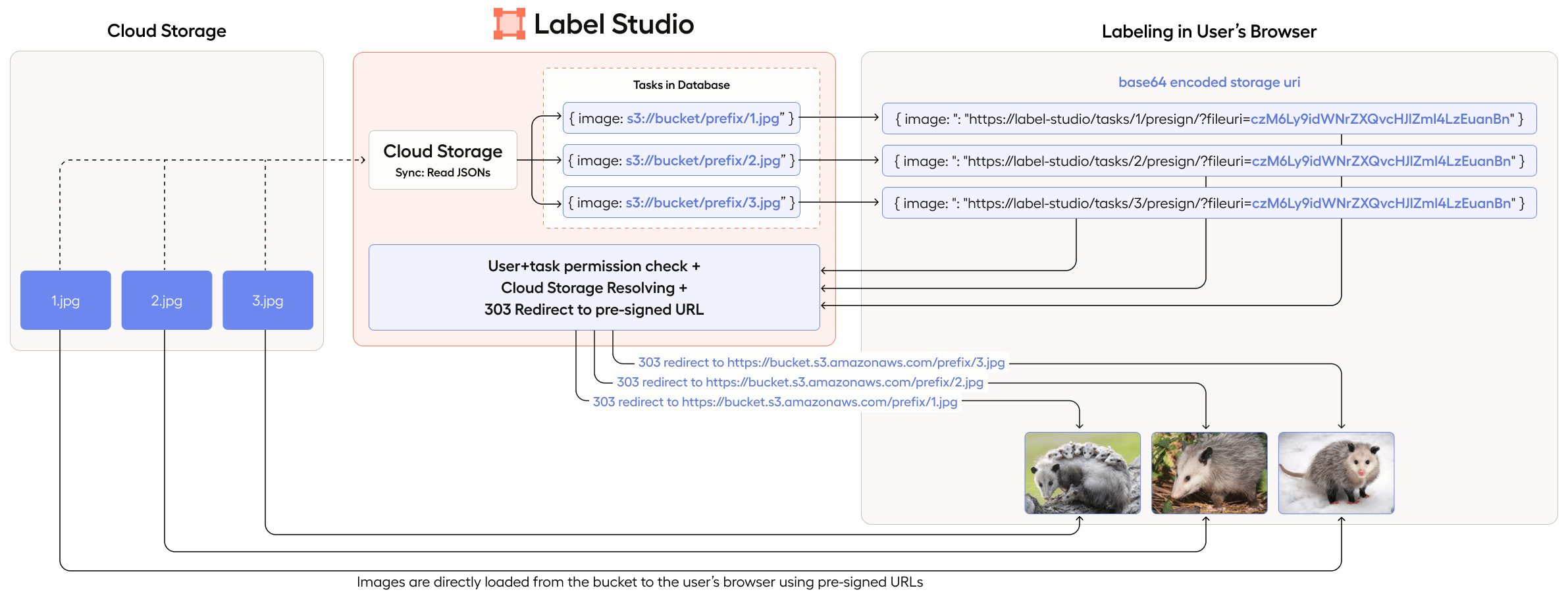 Task data synced from cloud storage is not stored in Label Studio. Instead, the data is accessed using presigned URLs. You can also secure access to cloud storage using VPC and IP restrictions for your storage. For details, see Secure access to cloud storage.
